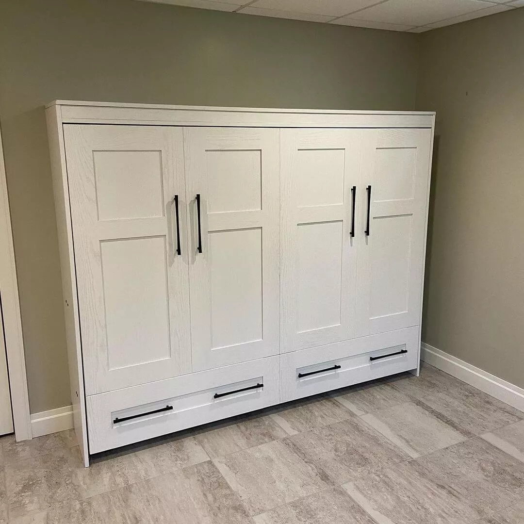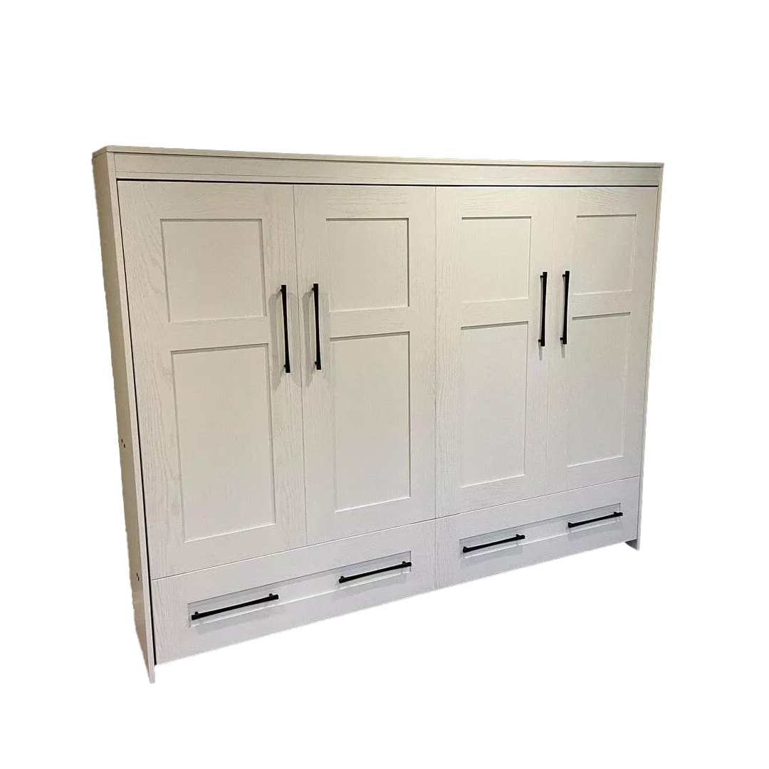 Muti-panel faux doors adorn the decorative face of this Georgetown murphy bed. Brushed chrome hardware adds the perfect decorative element to accentuate this piece. Regardless of your living situation, make the most of your multi-use space with this versatile murphy bed. Its convertible design lets you transform any room in your home into a guest room at a moment’s notice. The vertical orientation sleeps exactly like a typical bed, and allows for a 12″ thick inner spring mattress.