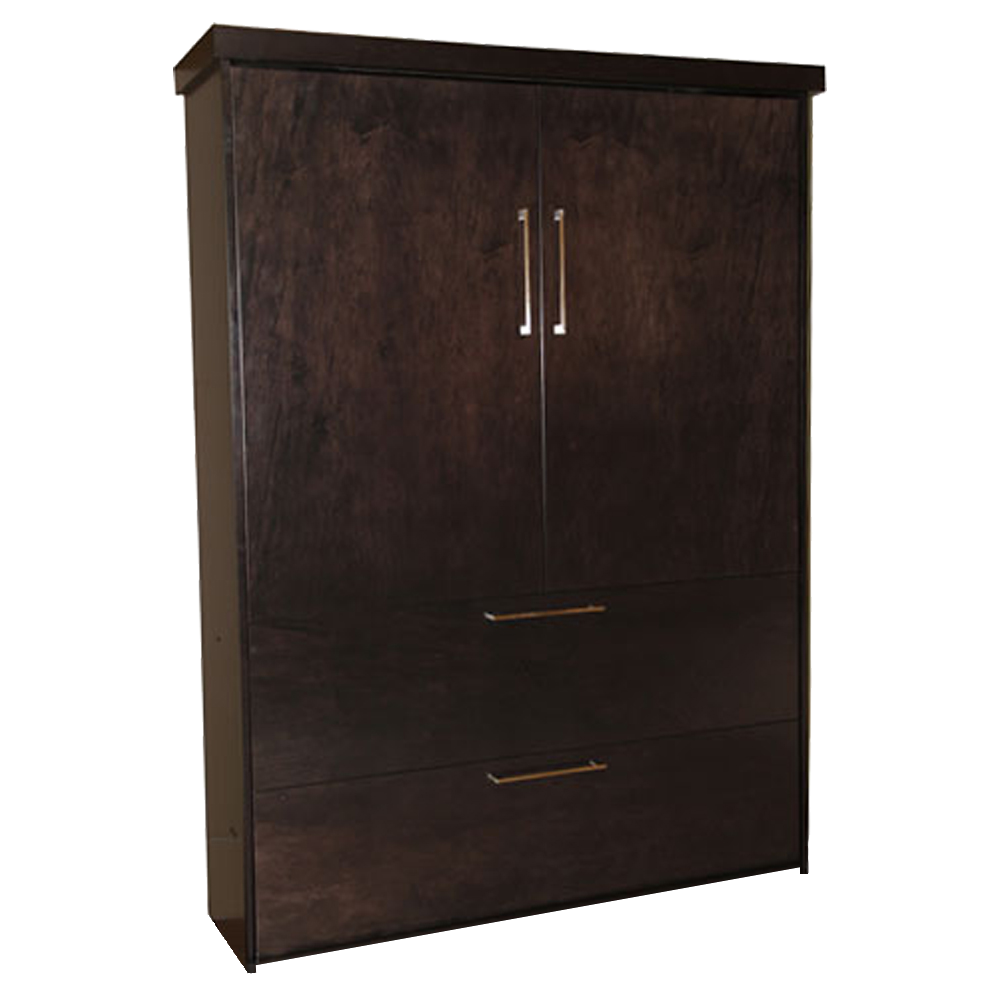 11 1/2″ brushed chrome handles add a modern flair to the faux double doors and drawers on this Chelsea Point murphy bed. Its sleek wardrobe cabinet design will compliment any room’s décor.